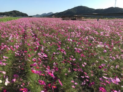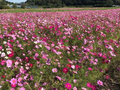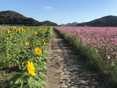 今季のコスモスがいよいよ見頃を迎えました。8月19日に播種したのが第1弾で順々に区画を分けて咲くようにしていて、初めて「クリアスマイル」という品種のひまわりも同時に咲かせています。